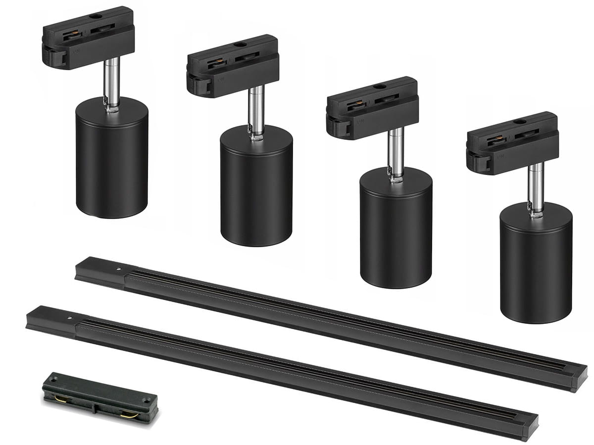 4 x Reflektor szynowy LED na żarówkę GU10 czarny + dwie szyny 1m + łącznik liniowy