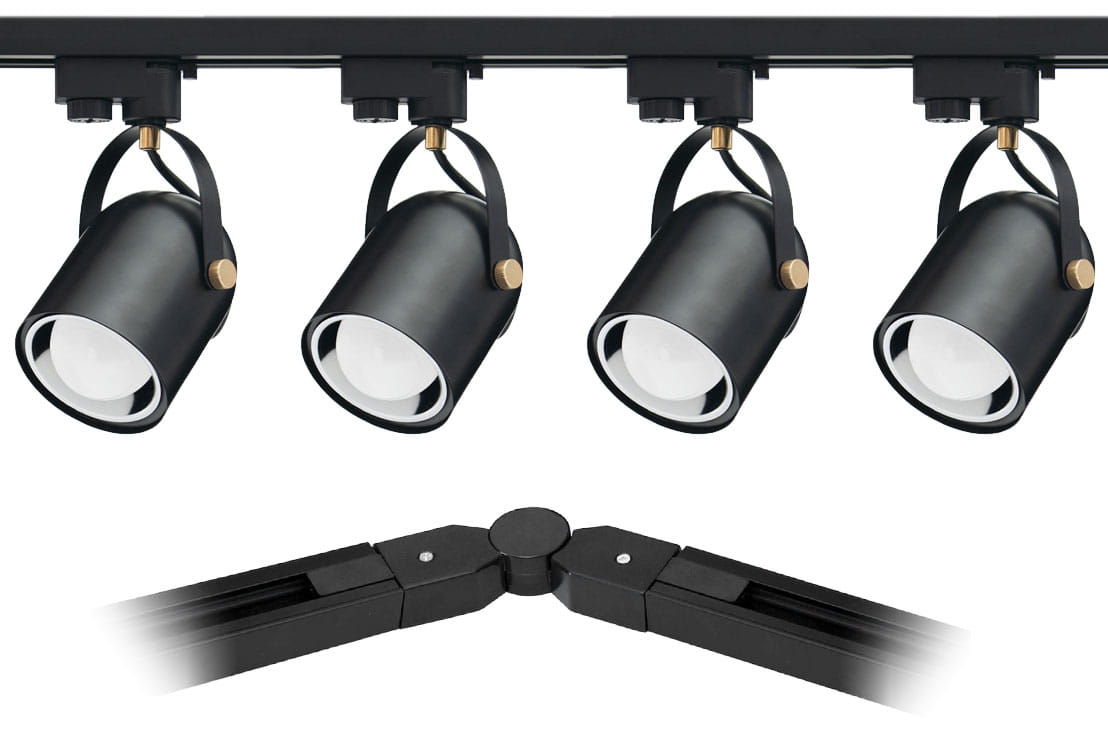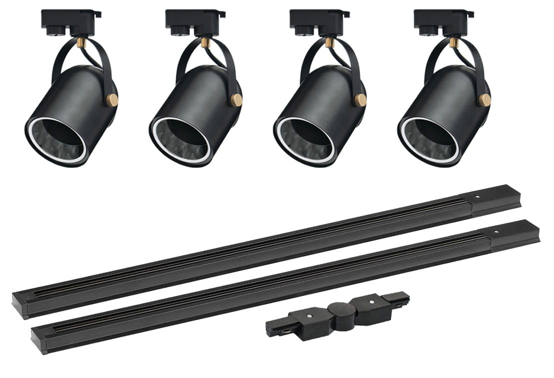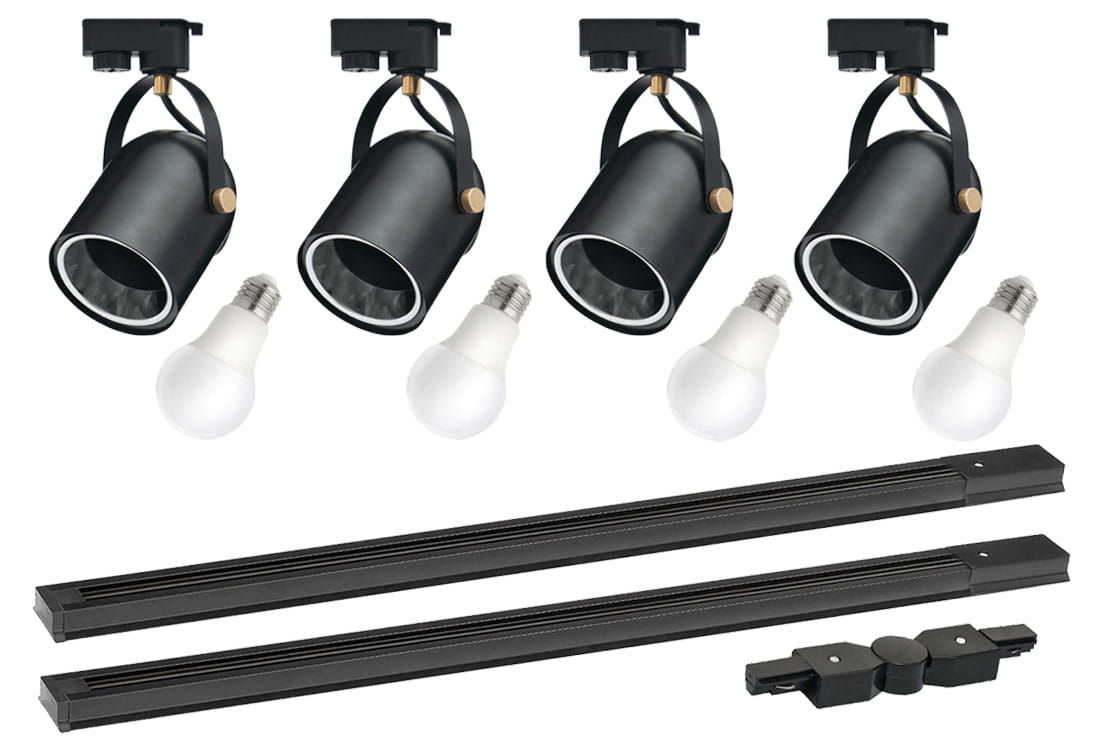 4x Lampa szynowa czarna na żarówkę E27 + 2x szynoprzewód 1m + łącznik ruchomy 1-fazowy