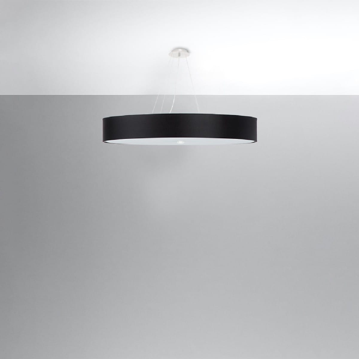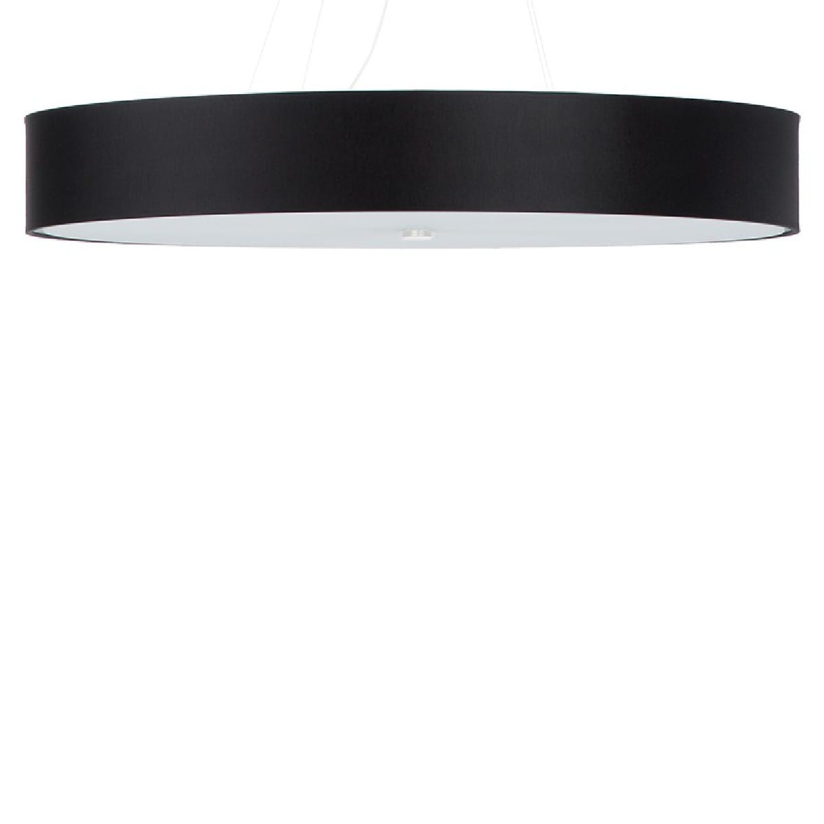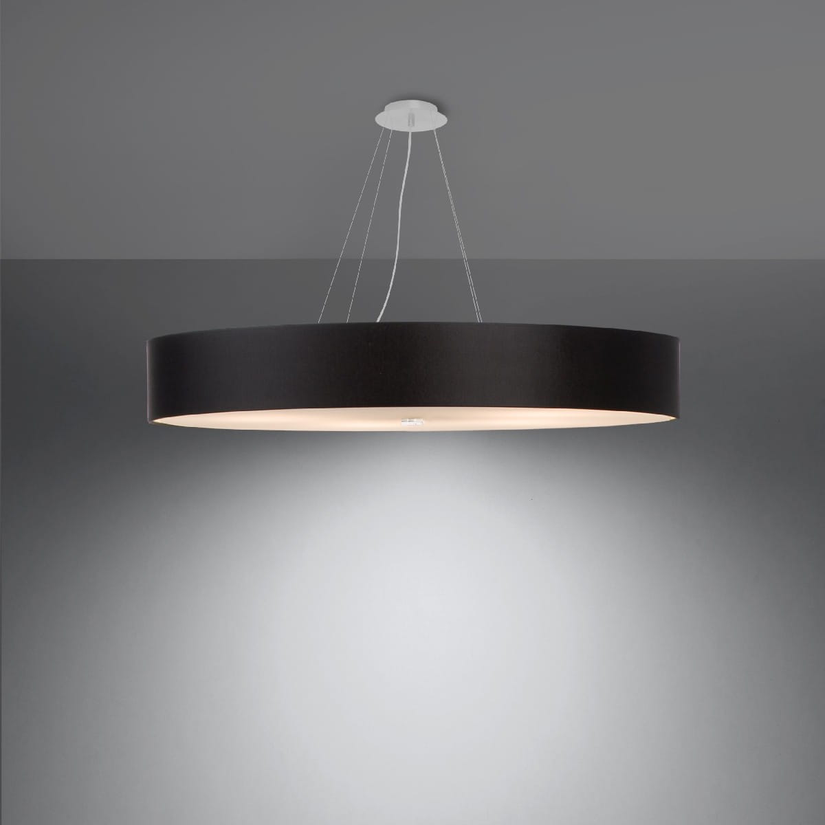 Duża lampa wisząca czarna z abażurem SKALA 100 cm do stosowania w pomieszczeniach - do salonu, sypialni, jadalni, biura czy pokoju. Klasyczny i elegancki zarazem wygląd. 100 cm średnicy i aż 6 źródeł światła z popularnym gwintem E27. Możliwość regulacji zawiesia. Solidne wykonanie - materiałowe obicie oraz stalowa konstrukcja.