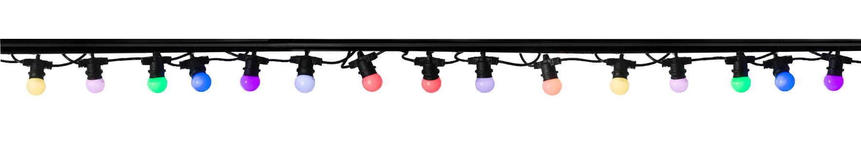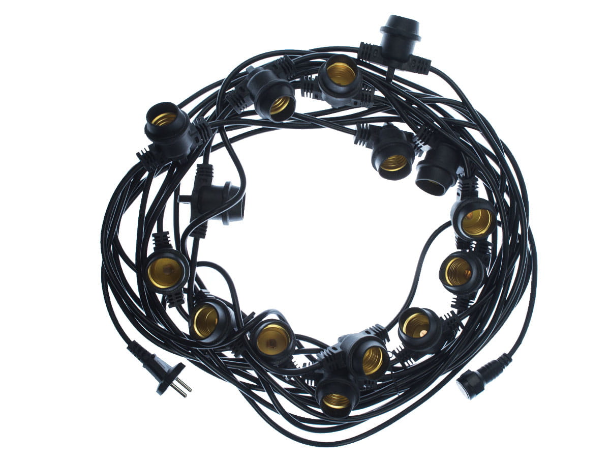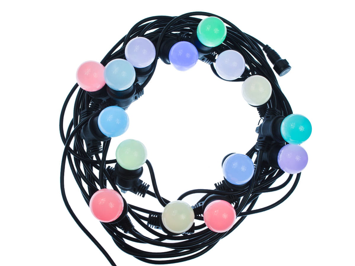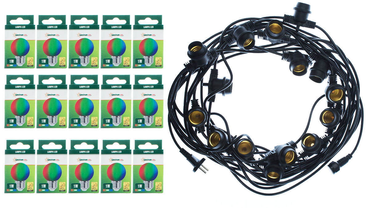 Kupując jedną sztukę otrzymasz czarną girlandę o długości 15m z 15 oprawami na żarówkę E27 oraz 15 żarówek LED RGB 1W.