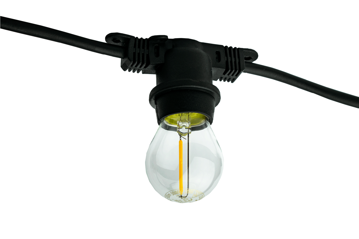 Girlanda świetlna o łącznej długości 30 metrów (składa się z dwóch girland po 15 metrów) w zestawie z 30 żarówkami z gwintem E27 o mocy 1,3 W i ciepłej barwie światła to doskonała dekoracja, która może ozdobić Twój taras, balkon lub altanę.