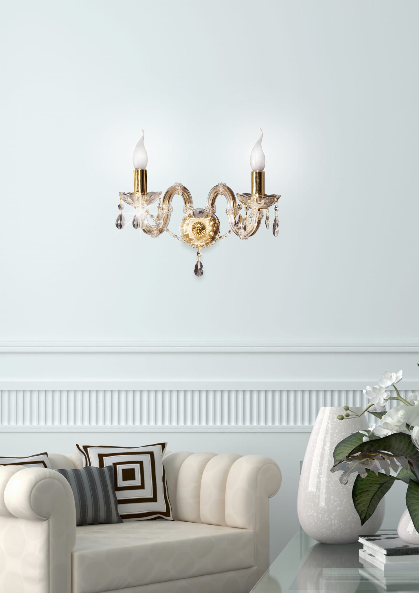 - Jakie wnętrza najlepiej dopełni ten kinkiet? -Ten kinkiet to cudowne uzupełnienie wnętrz w stylu klasycznym, barokowym, który również znakomicie rozświetli sale bankietowe oraz weselne.