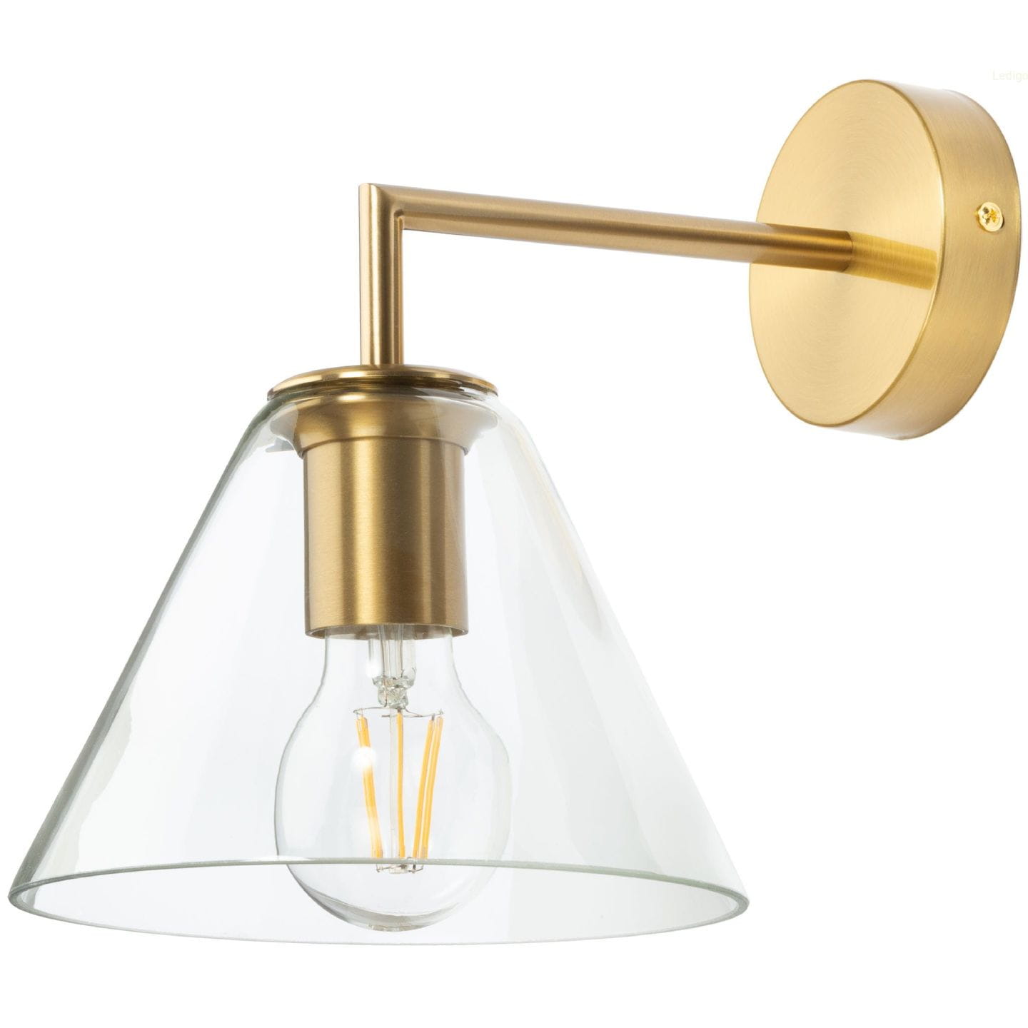 - Materiał: Przezroczysty klosz ze szkła w kształcie stożka (średnica: 18,5 cm, wysokość: 14 cm) oraz złote metalowe ramię (długość: 15 cm) zakończone oprawką na wymienną żarówkę E27.