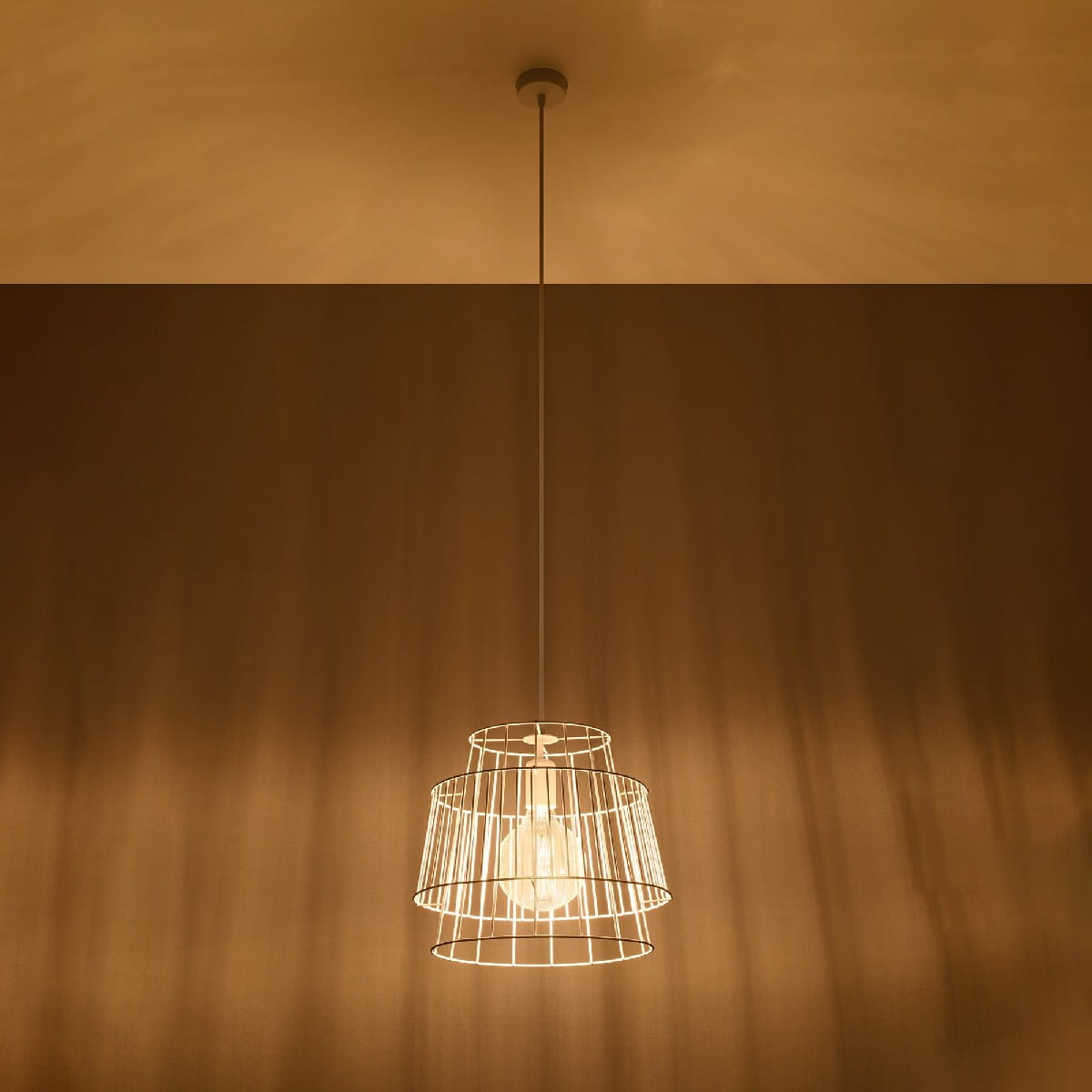 Nowoczesna lampa zbudowana z dwóch metalowych drucianych kloszy, wsadzonych jeden w drugi. Solidna konstrukcja będzie służyć w Twoim pomieszczeniu nawet przez kilkanaście lat. Ciekawy loftowy design idealnie sprawdzi się w minimalistycznie wyposażonych pomieszczeniach. Gwint E27 daje szerokie pole możliwości wyboru rodzaju żarówek, a możliwość regulacji wysokości zawieszenia lampy daje Ci komfort i pewność, że lampa będzie znajdowała się na takiej wysokości, jak sobie zażyczysz.