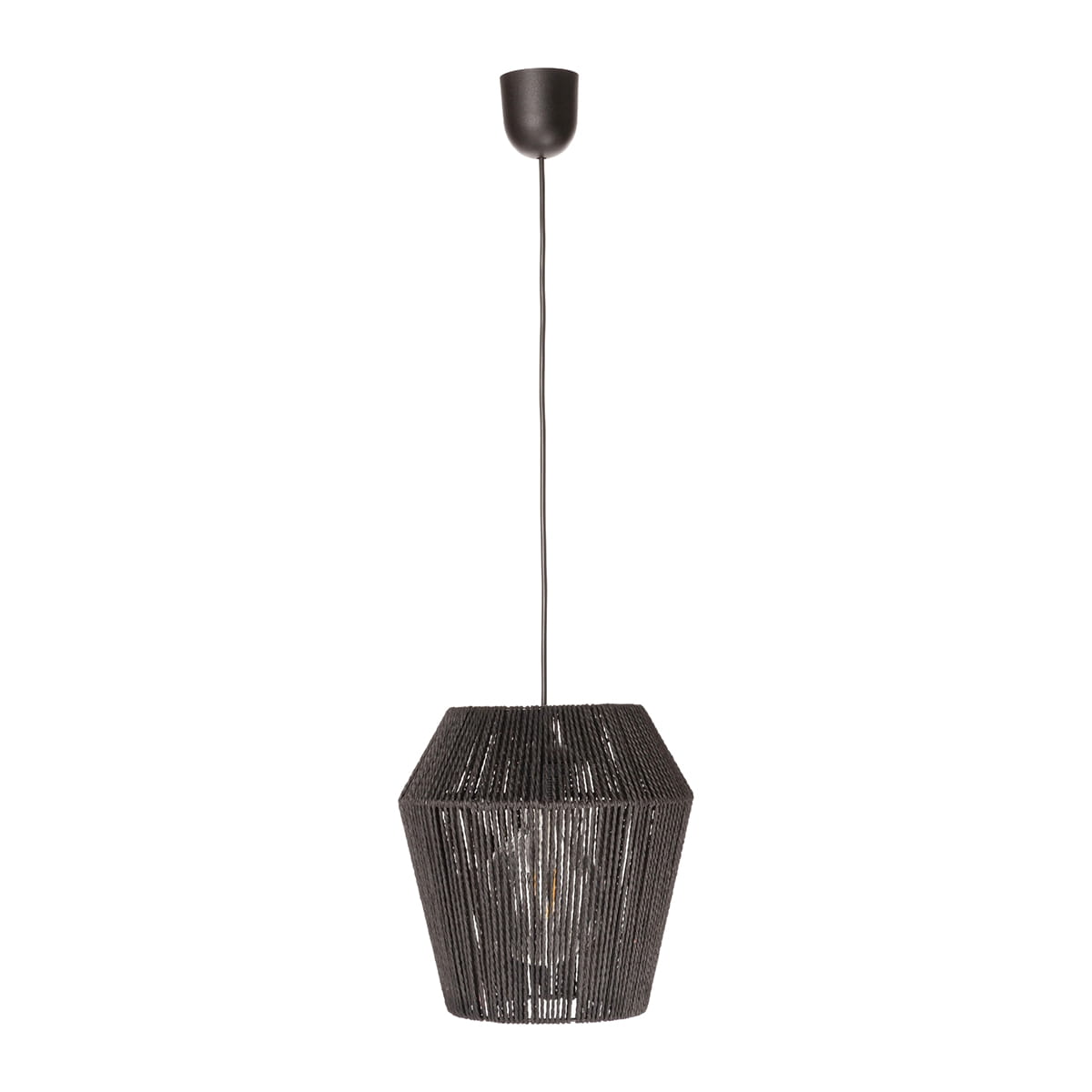 Lampa z plecionym kloszem w uniwersalnym kolorze czarnym. Kształt nieco przypominający diament. Klosz wykonano z lekkiego i zarazem wytrzymałego impregnowanego papieru. Konstrukcja lampy jest metalowa. Klosz wymienny. Gwint na żarówki E27 - dzięki czemu możesz dobrać sobie kolor, kształt, wielkość, barwę żarówki. Możliwość regulacji wysokości zawieszenia.