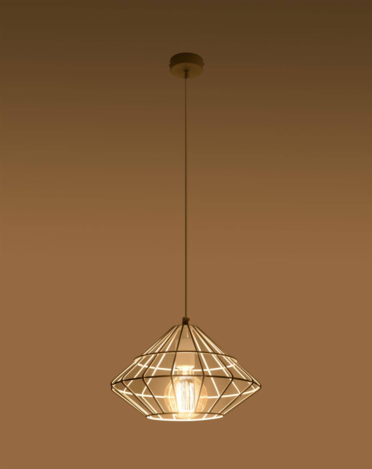 Ta piękna, druciana lampa wisząca UMBERTO dzięki swojej formie przywodzi na myśl idealnie oszlifowany diament. Oferowany model doskonale prezentuje się w loftowych i industrialnych aranżacjach. Lampa wisząca druciana UMBERTO to nie tylko funkcjonalne oświetlenie salonu czy kuchni, ale także unikalna dekoracja, która nada pomieszczeniu niepowtarzalnego charakteru.
