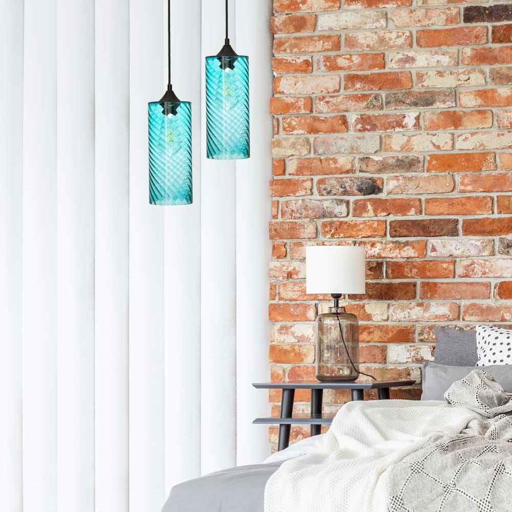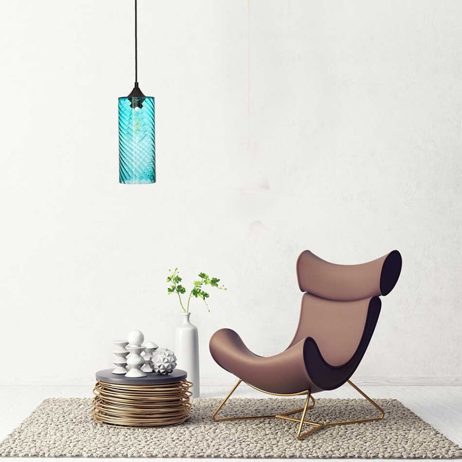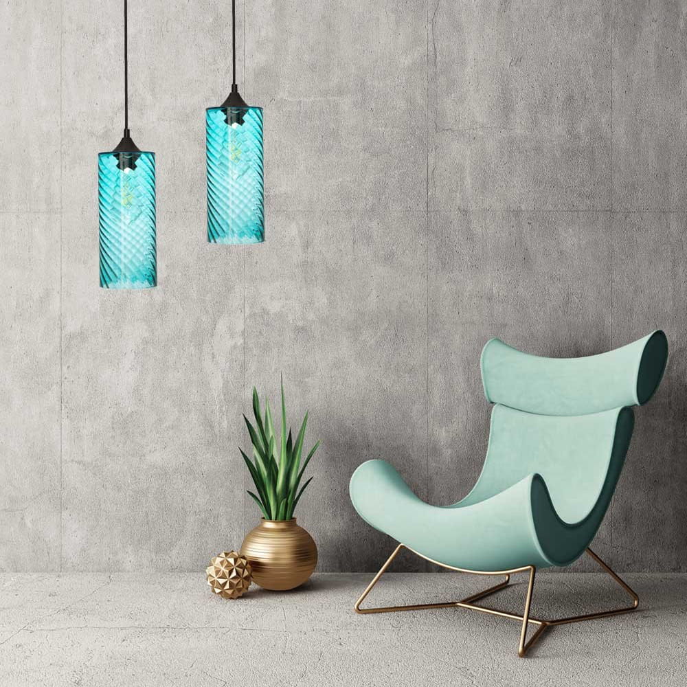 Lampa ze szklanym niebieskim - wymiennym - kloszem o falistej strukturze, dzięki której żarówka wewnątrz wygląda jakby znajdowała się w wodzie. Klosz ma średnicę 11,5 cm. Wysokość zawieszenia lampy możesz sobie regulować według swoich potrzeb. Kolor kabla, podsufitki i mocowania - czarny. Gwint żarówki - E27, masz duży wybór wśród żarówek różnej wielkości, mocy, kształtu. Idealna lampa do kuchni, jadalni, ale nie tylko, może sprawdzić się także w salonie czy innym pomieszczeniu.