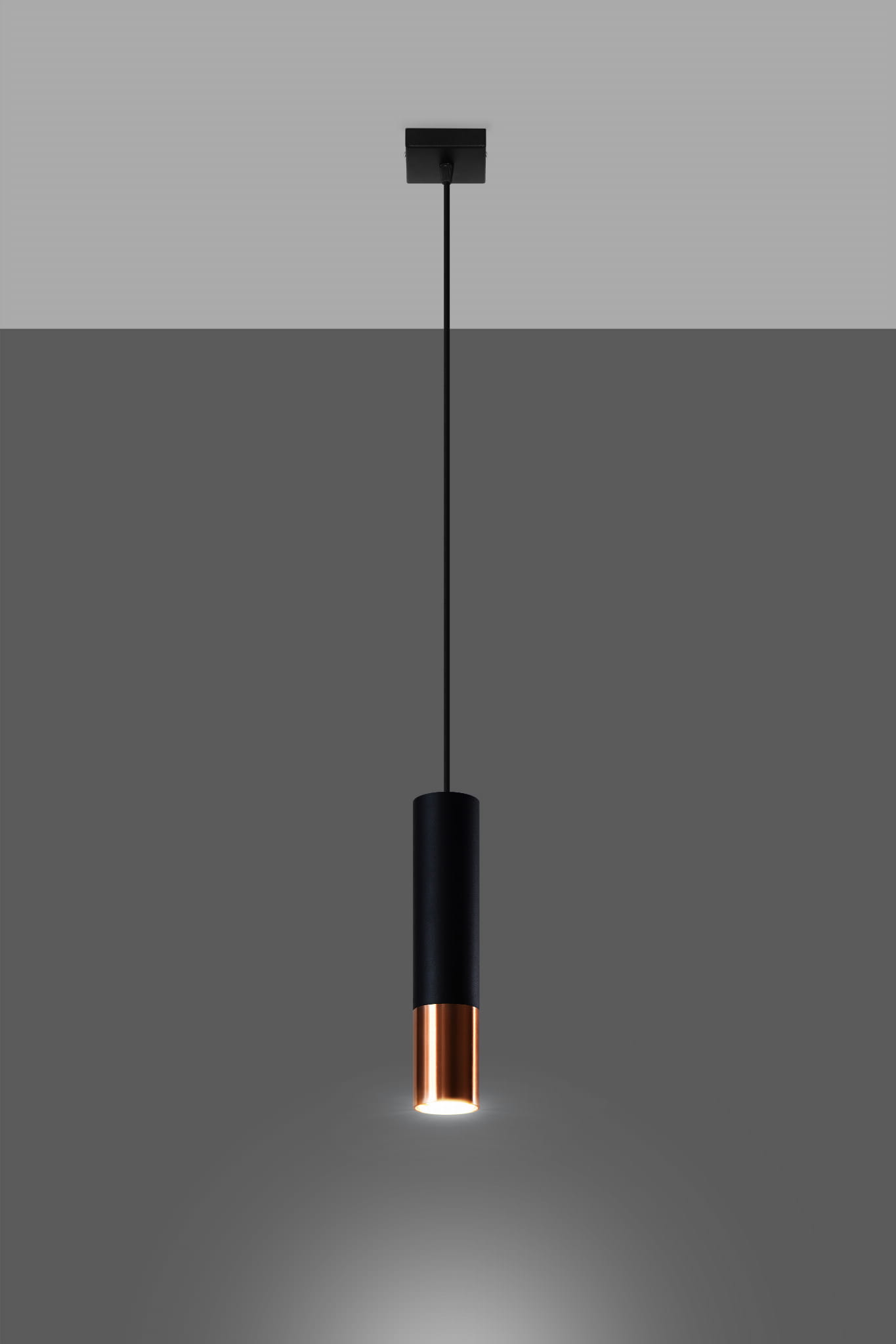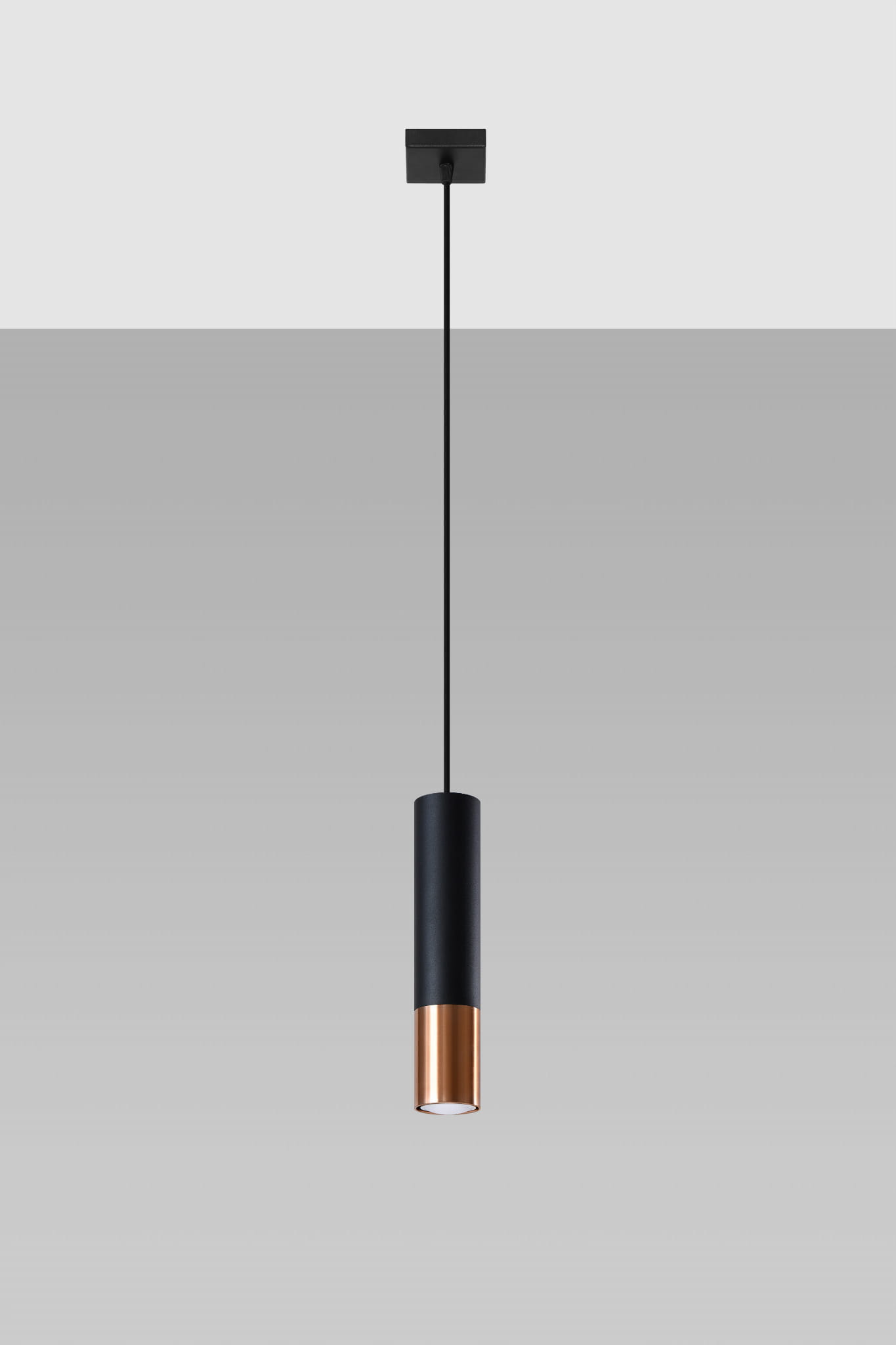 Elegancka, minimalistyczna lampa wisząca, której forma i kolorystyka wpisuje się w aktualne trendy wnętrzarskie. Obudowa w kształcie podłużnej tuby została wykonana z trwałej stali malowanej proszkowo. W przypadku tego modelu głęboka czerń została przełamana metalowymi elementami w miedzianym kolorze. Lampa została wyposażona w uniwersalny system montażowy. Dzięki temu bez trudu zainstalujesz ją samodzielnie!