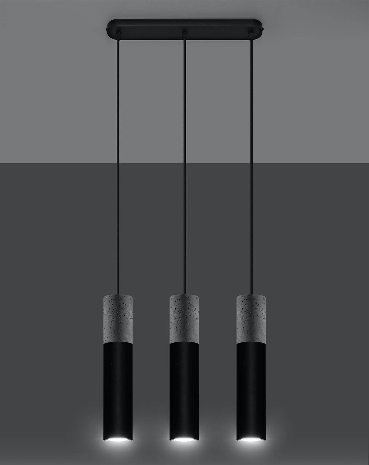Beton i stal to domena surowych, industrialnych wnętrz. Lampa wisząca BORGIO została stworzona z myślą właśnie o takich aranżacjach. Oferowany model został wyposażony w 3 źródła światła, więc bez problemu oświetlisz nim korytarz, stół w jadalni czy kuchenny blat. Czarna, stalowa oprawa w kształcie tuby została przełamana betonowymi elementami, co nadaje lampie wyrazistości.