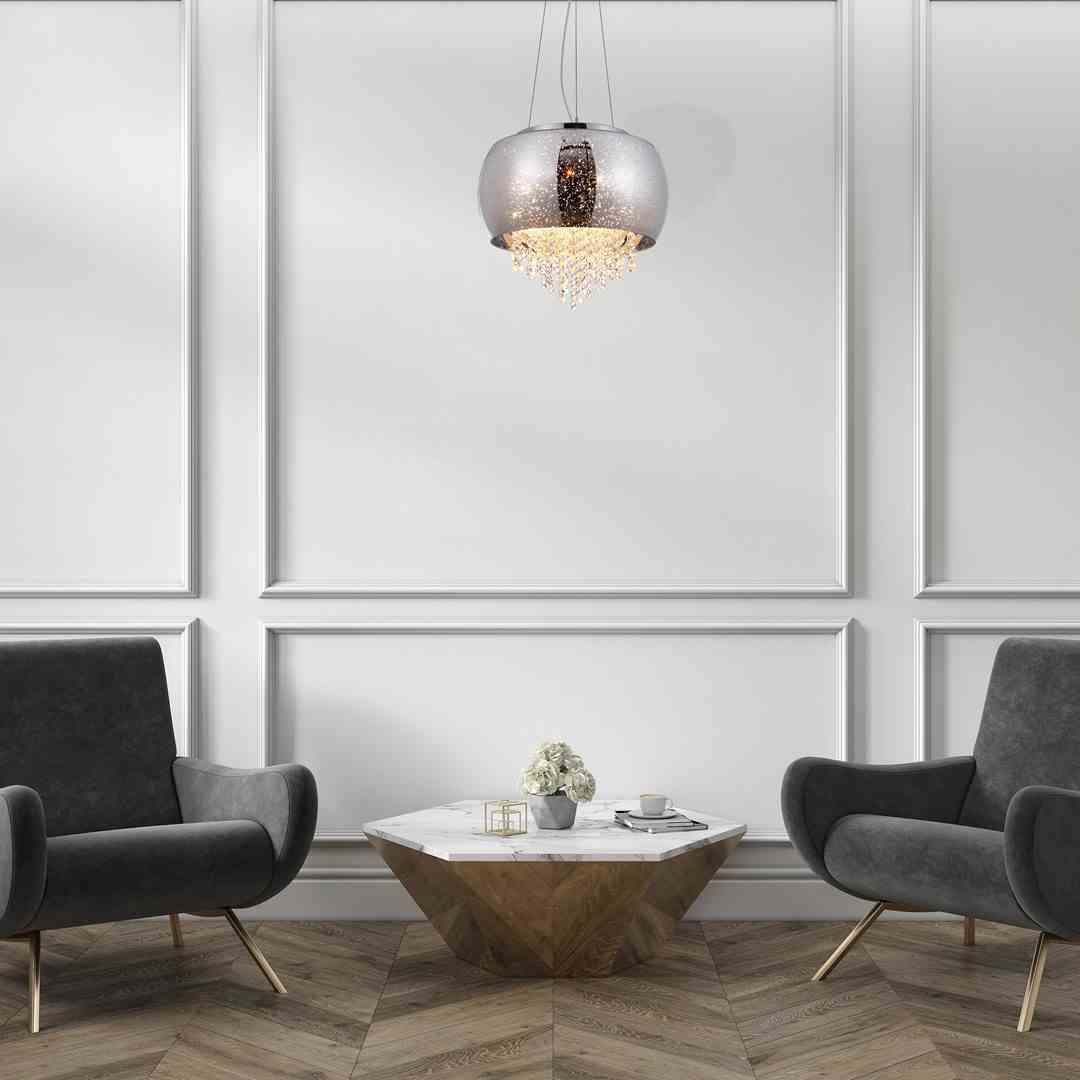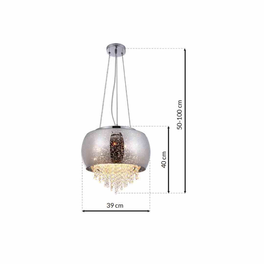 Zjawiskowa lampa wisząca w kształcie szerokiego pierścienia wykonana ze szkła, ozdobiona wiszącymi wewnątrz kryształkami. W tej lampie możesz zamontować, aż 3 źródła światła typu LED E14 co przekłada się na wysoką funkcjonalność urządzenia. Lampę z powodzeniem możesz wykorzystać jako oświetlenie główne salonu, sypialni czy jadalni. Wyjątkowy design i bogactwo detali sprawia, że lampa doskonale komponuje się ze stylem glamour oraz art deco.