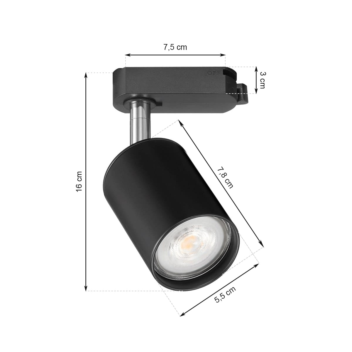 Czarny reflektor szynowy na żarówkę GU10 daje ogrom możliwości w zakresie tworzenia konfiguracji świetlnej. Dzięki możliwości obracania lampy w zakresie 90° w pionie i 360° w poziomie możesz wyeksponować najciekawsze elementy wystroju. Oferowany reflektor przeznaczony jest do montażu na szynie jednofazowej. Ilość lamp i ich ustawienie zależy tylko i wyłącznie od Ciebie! Mało widoczny adapter i przyłącze sprawiają, że oferowany produkt jest bardzo estetyczny i sprawdza się także w niższych pomieszczeniach.