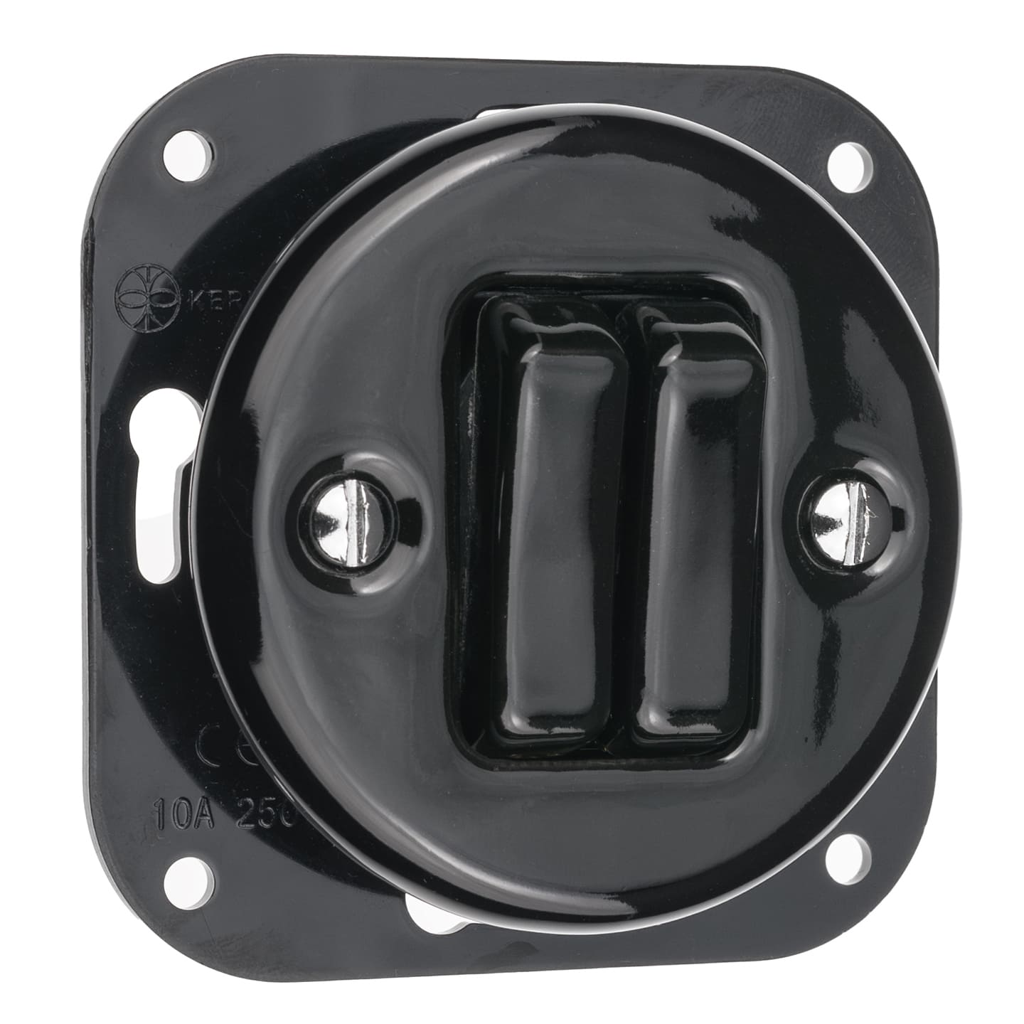 Czarny, okrągły włącznik światła o subtelnym retro designie. Wykonany z najlepszej jakości ceramiki z gładką powierzchnią. Wyposażony w dwa funkcjonalne przyciski, jest idealnie przystosowany do montażu w ramkę.