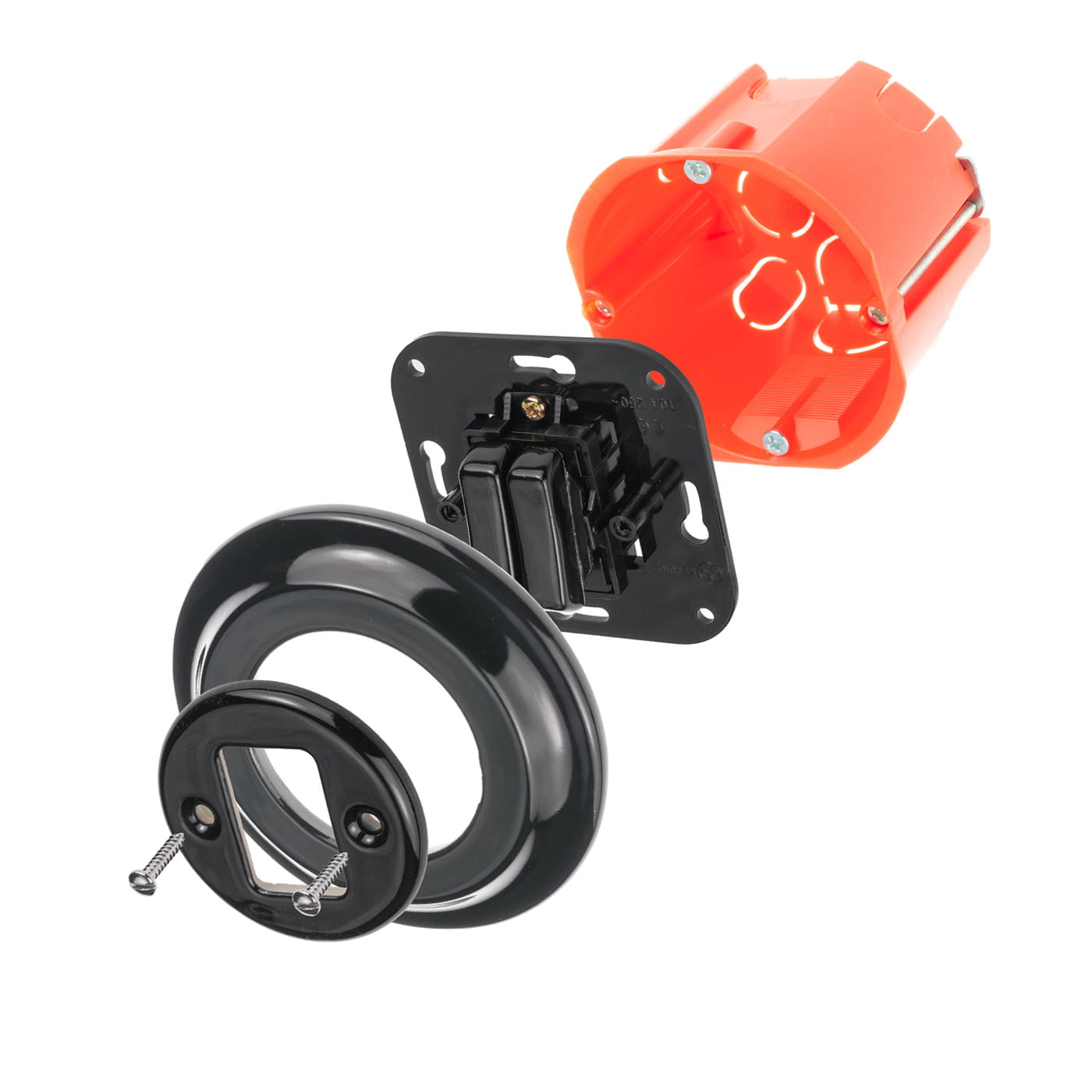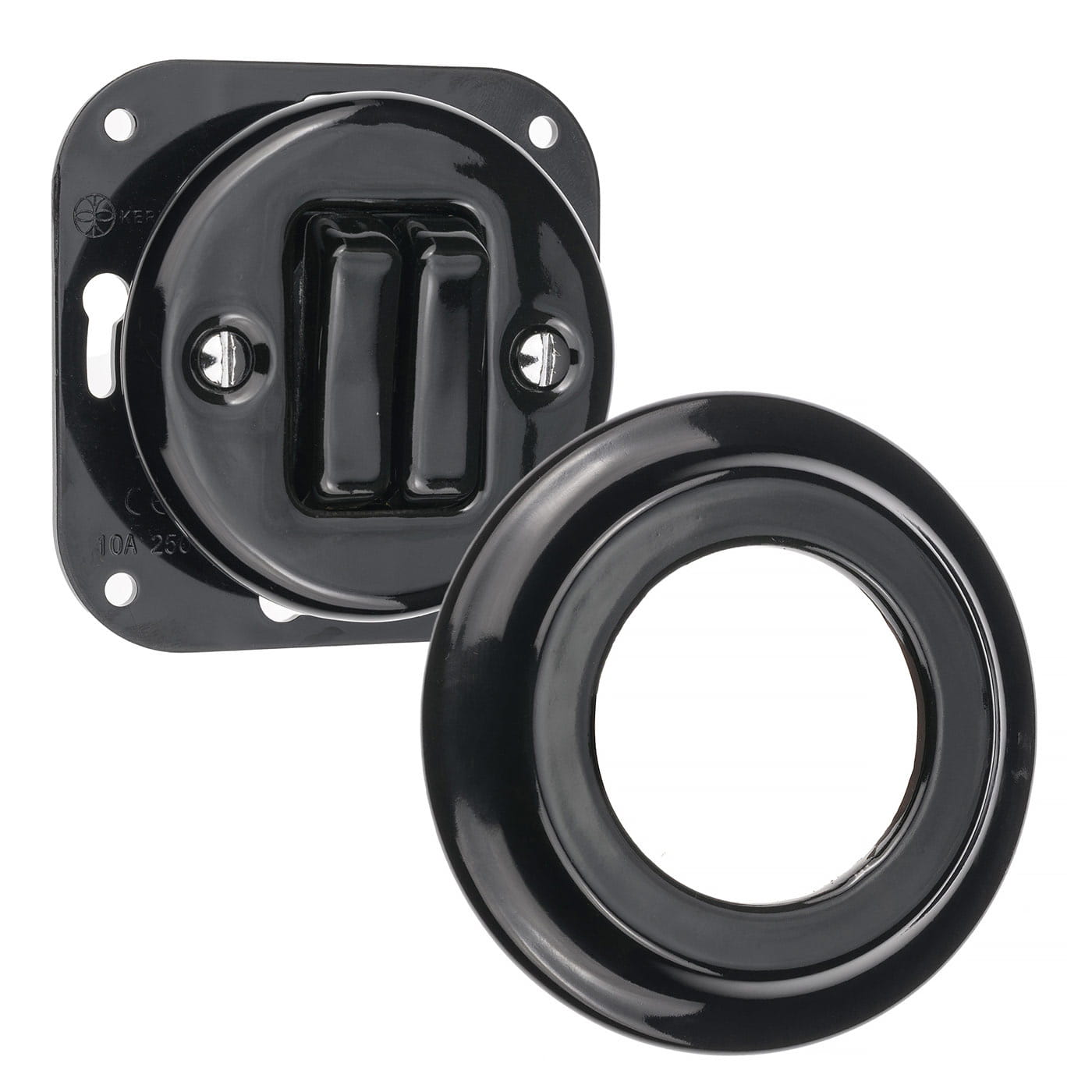 Wykonany z wysokiej jakości ceramiki w eleganckim czarnym kolorze, łączy funkcjonalność z klasycznym designem. Dzięki zaciskom śrubowym gwarantuje stabilne i bezpieczne połączenie z instalacją elektryczną, a rozstaw śrub 60 mm sprawia, że pasuje do standardowych puszek elektrycznych, co ułatwia montaż.
