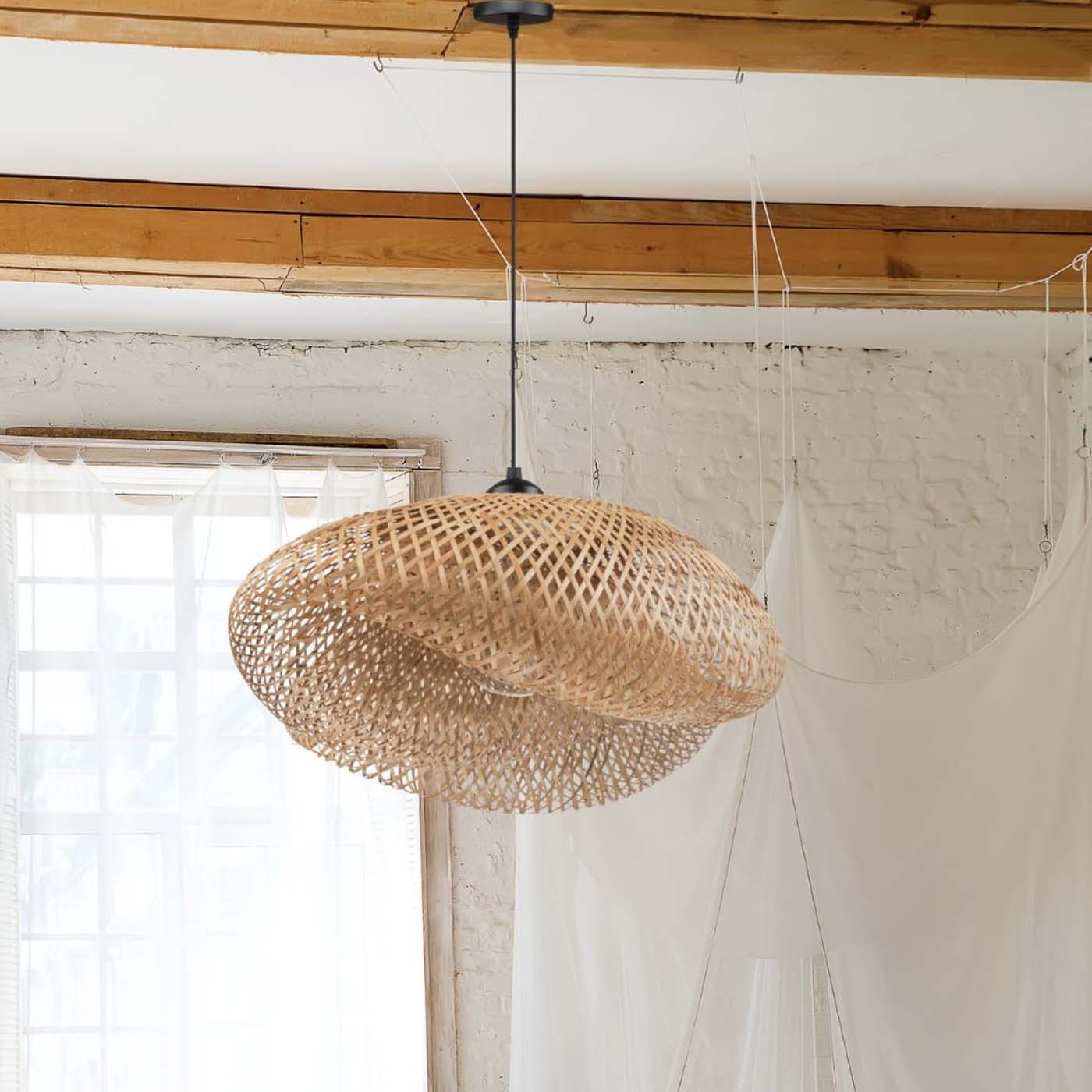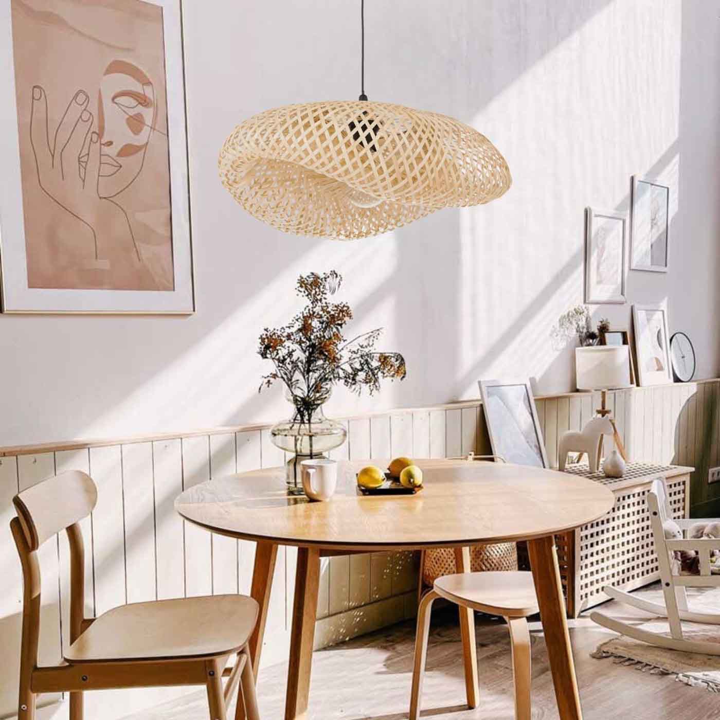 Żyrandol NUSA wykonany jest z bambusowej plecionki. Bardzo lekki, wyglądem przypominający muszlę. Ażurowy klosz sprawia, że światło rozprowadza się po pomieszczeniu, tworząc niesamowitą atmosferę. Lampa jest bardzo lekka, waży niespełna kilogram.